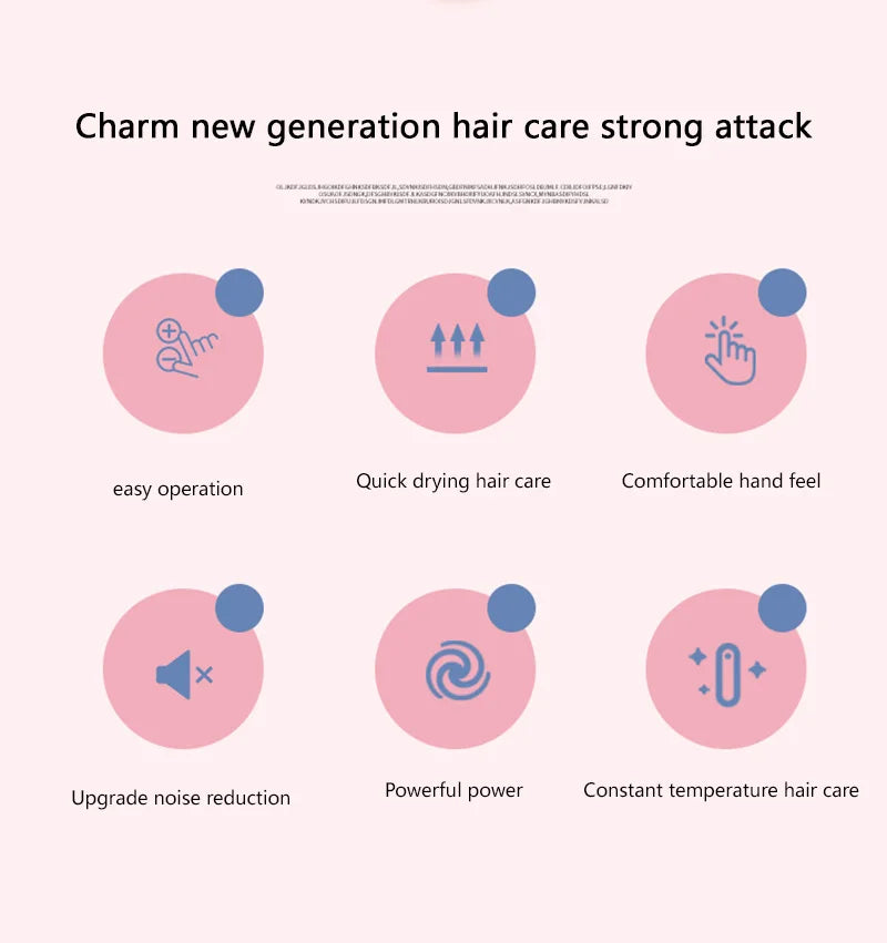 This hair dryer has a linear guide air duct system, is equipped with a powerful motor, and relies on centrifugation, inertia in order to achieve comfortable wind power and reduce abnormal noise.