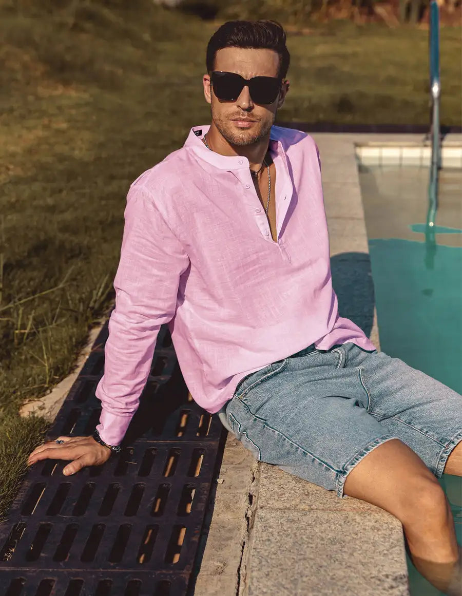 ??Fashion Design?a?? Casual Henley Collar Shirt, Stand Collar, Simple Style, Solid Color, Slim Fit, Long Sleeves (Rolled Hem), Button Down, Round Hem, Feature Button Details.