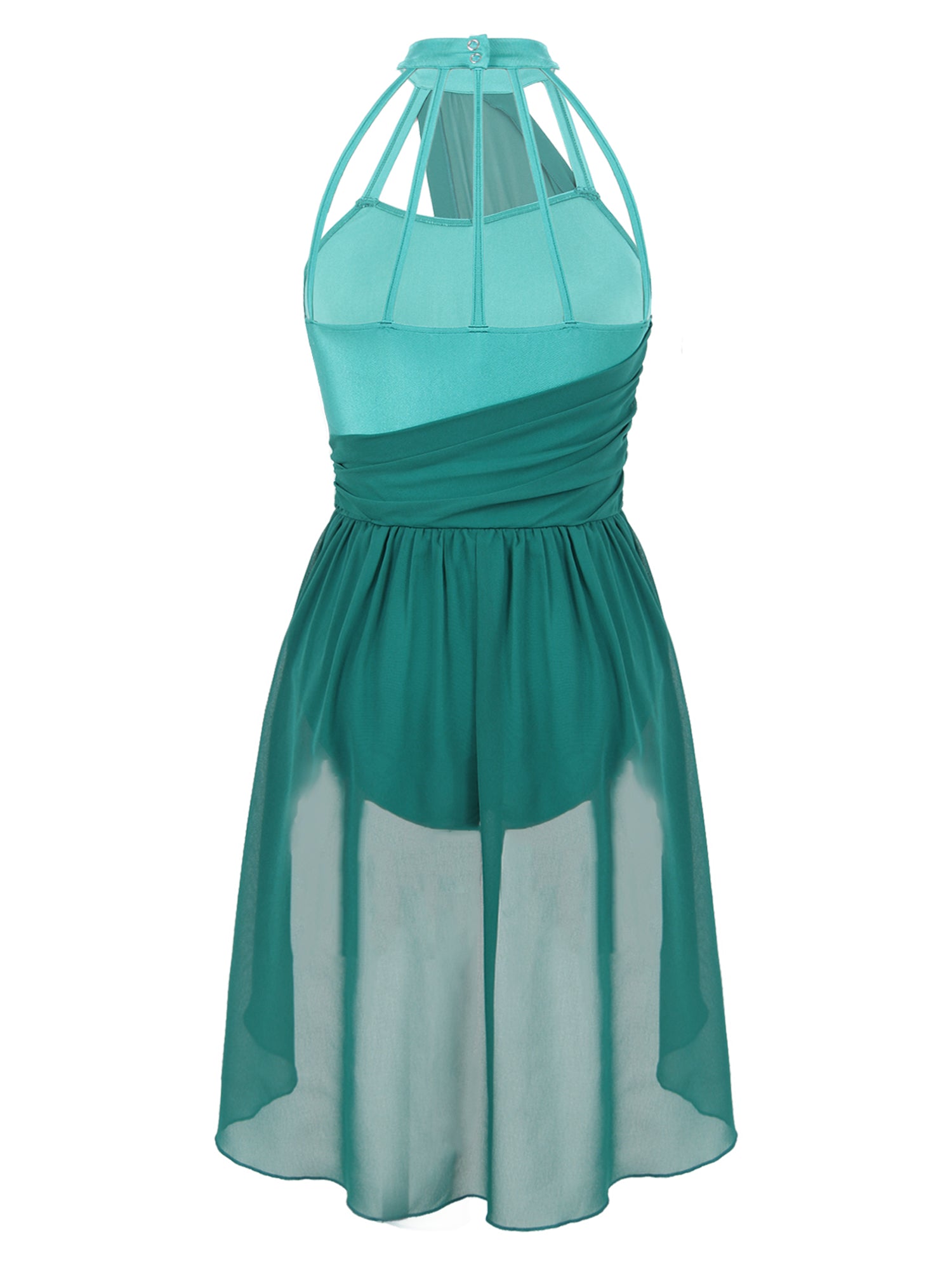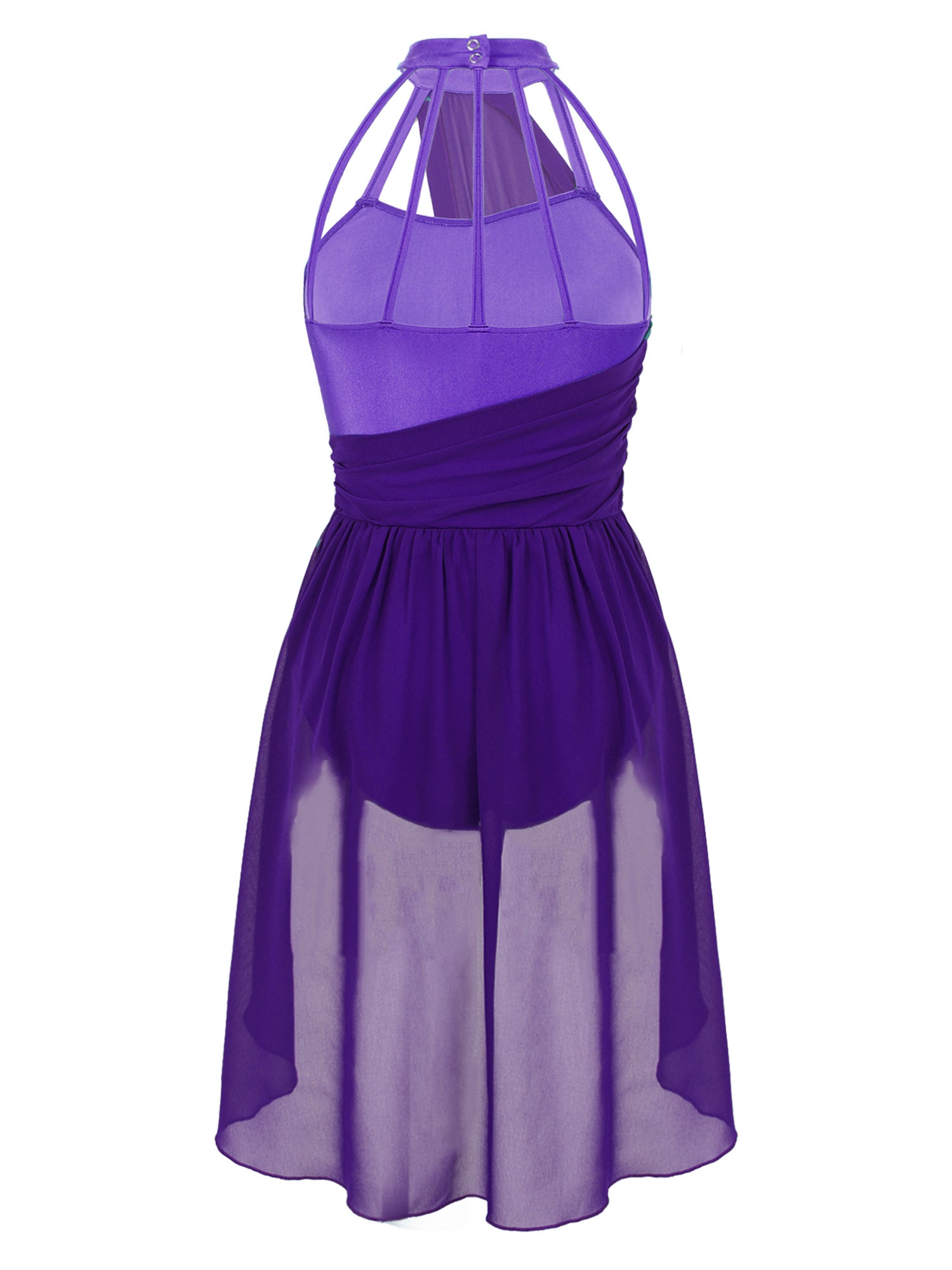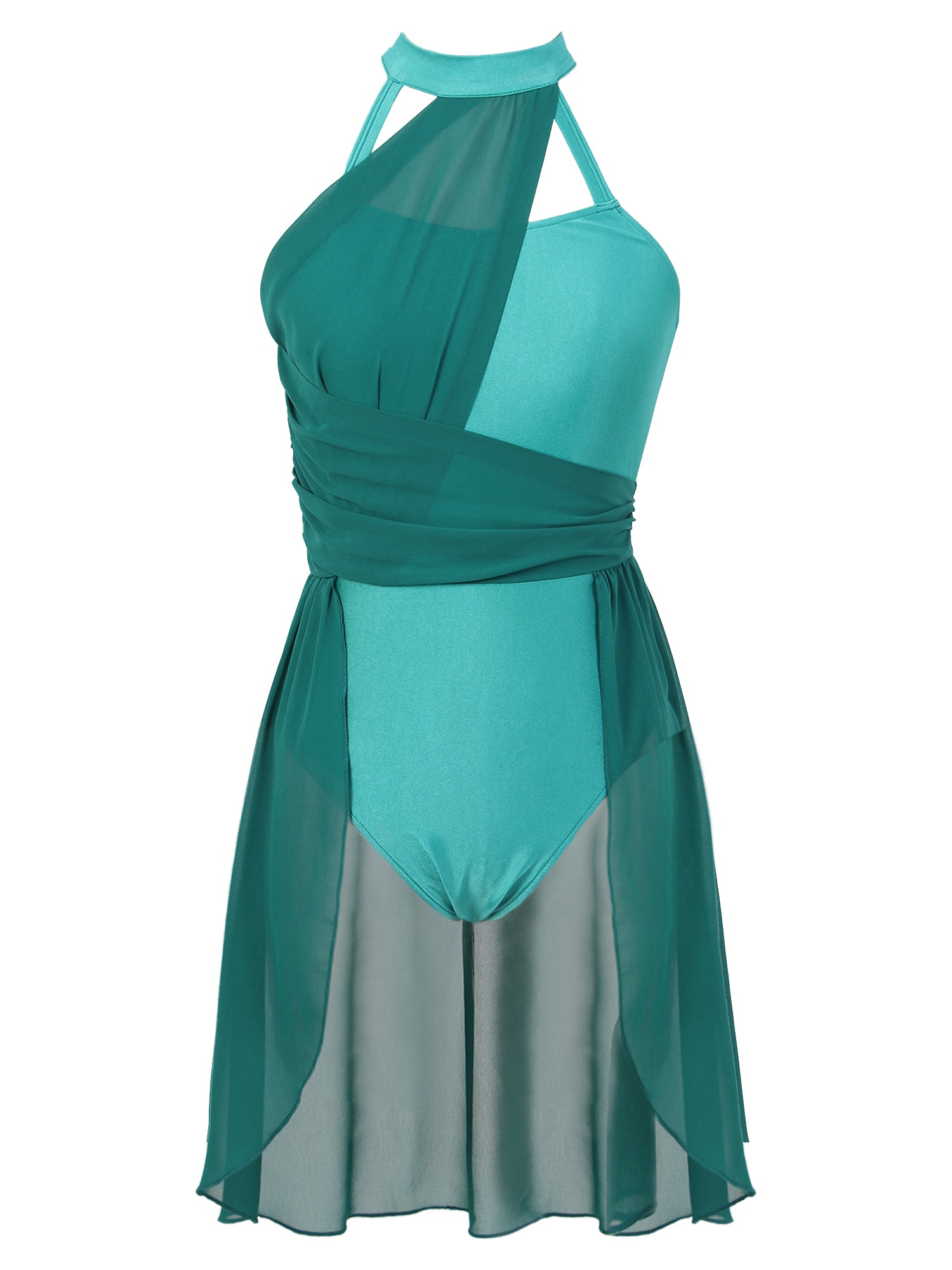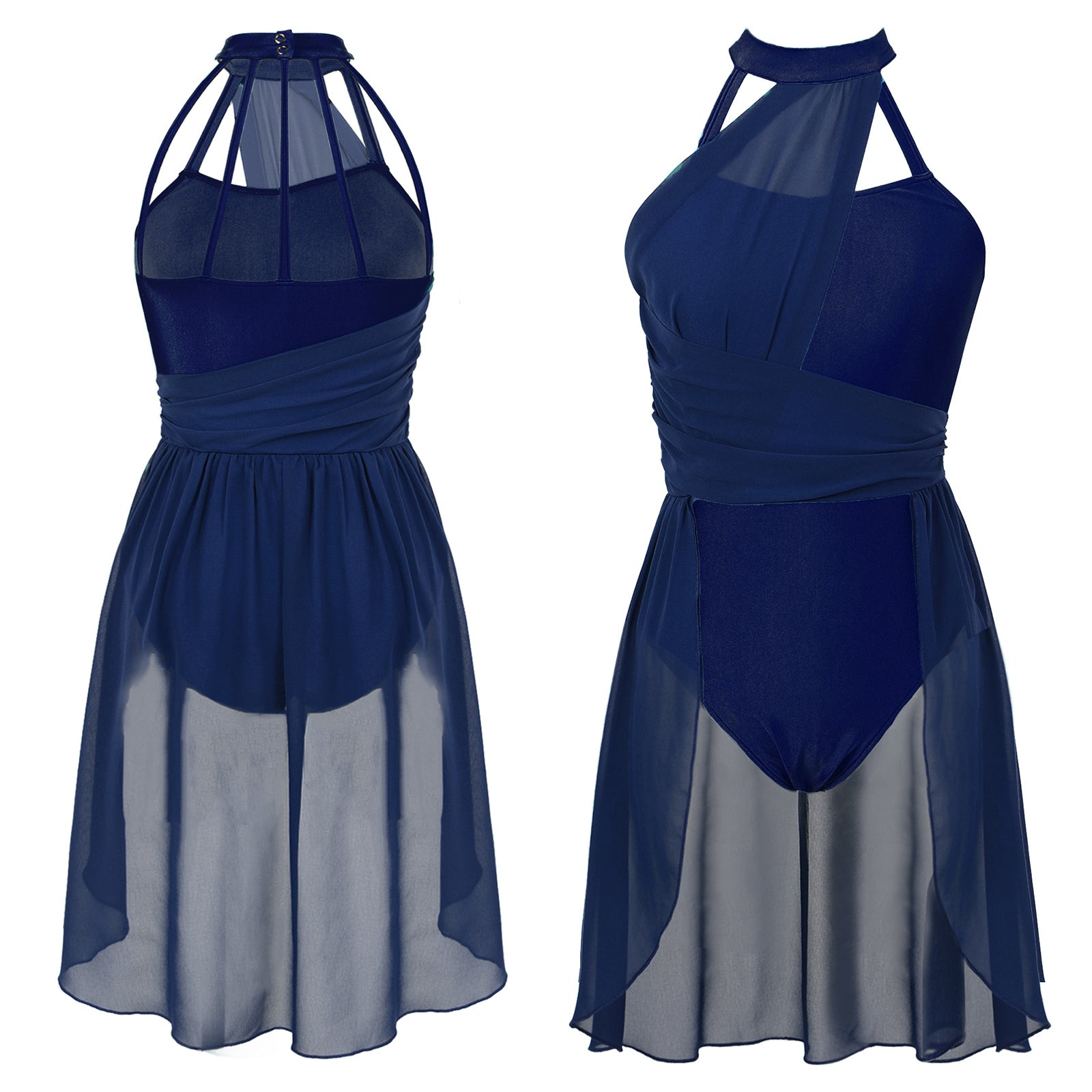 Womens Ruched Chiffon Patchwork Dancewear Back Strappy Sleeveless Leotard Dress.