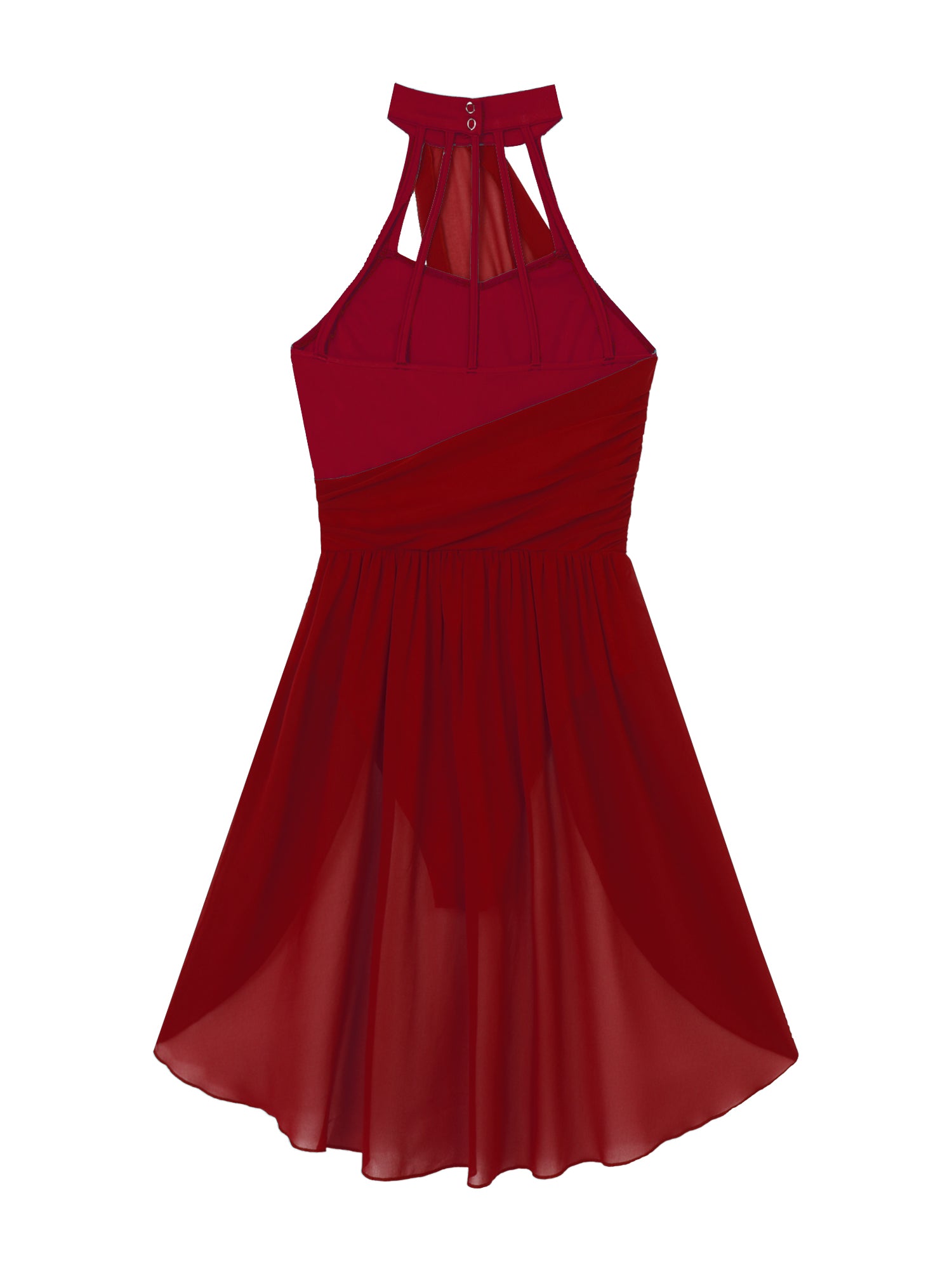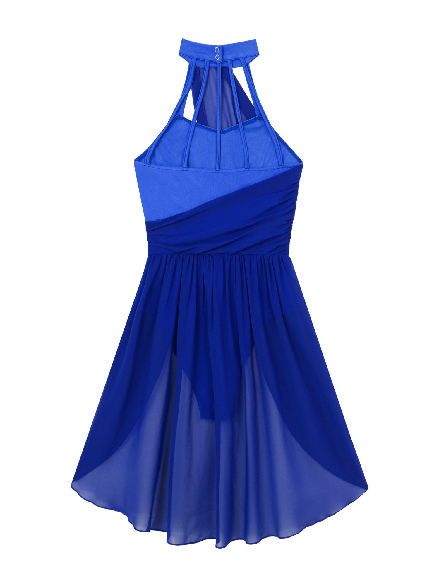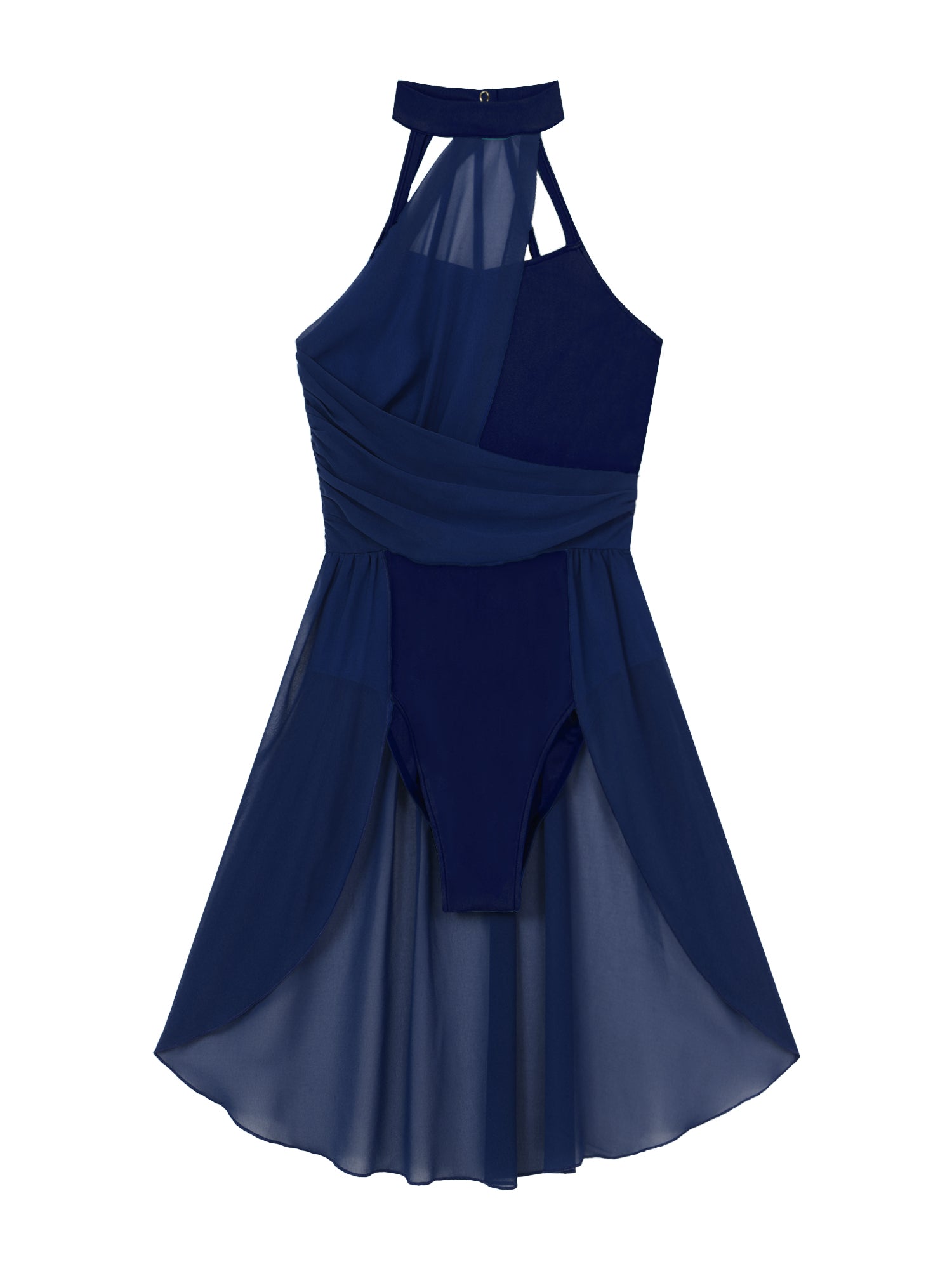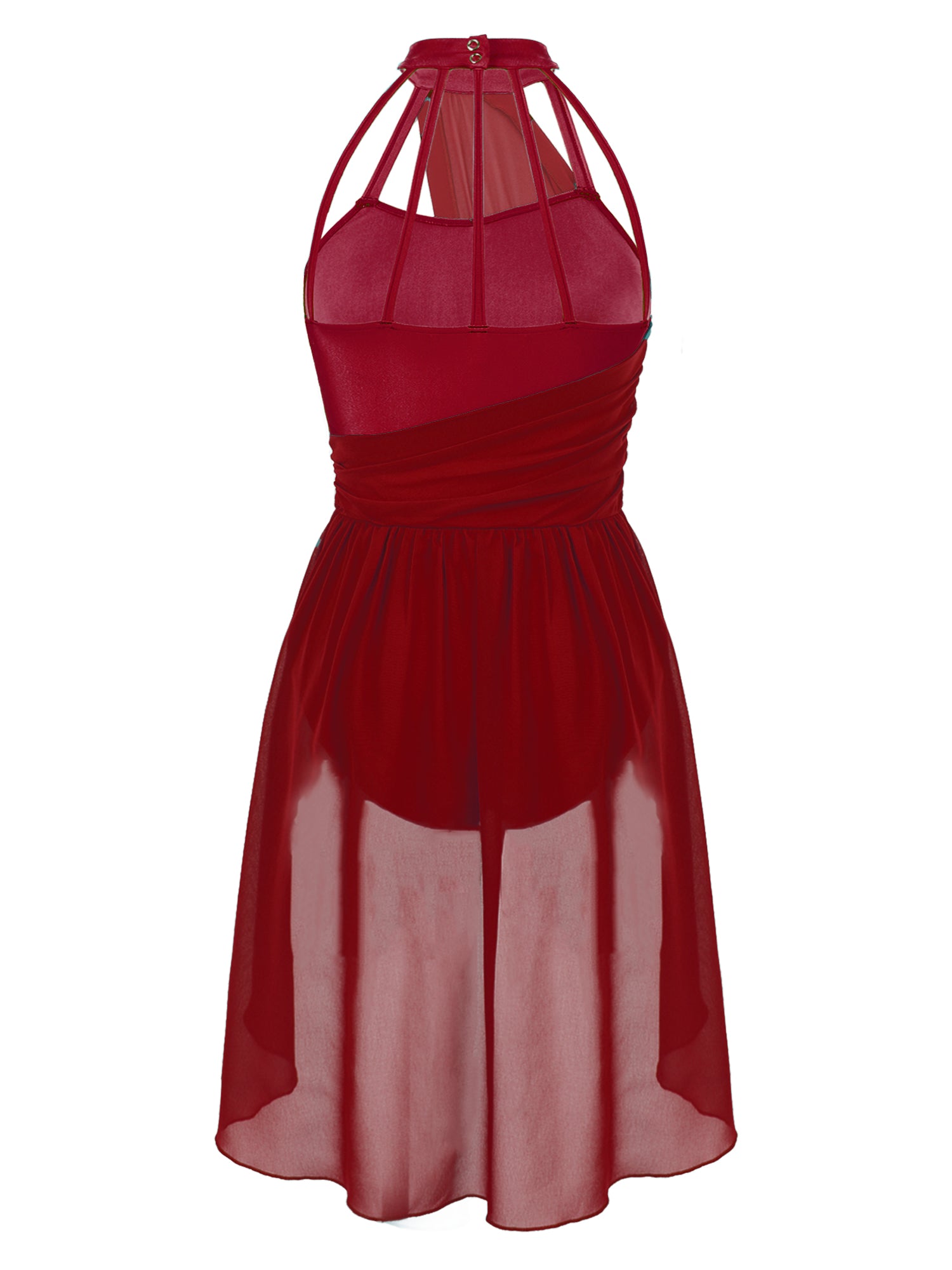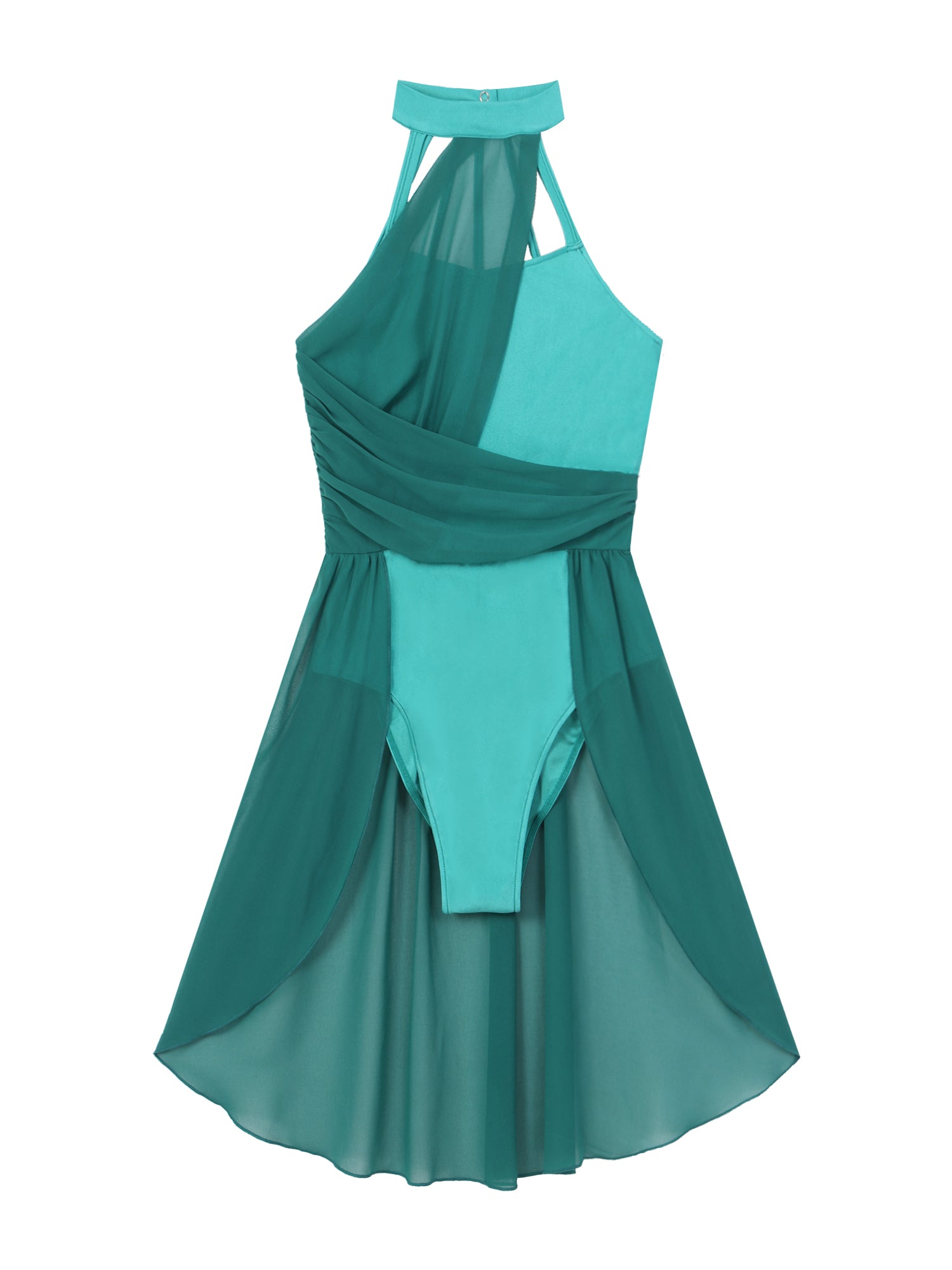 Womens Ruched Chiffon Patchwork Dancewear Back Strappy Sleeveless Leotard Dress.